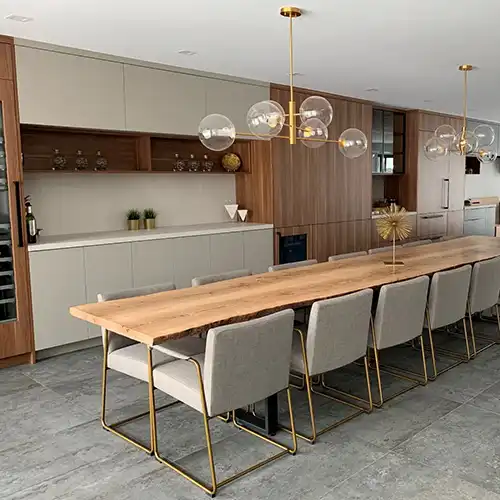 Visit our Toronto furniture showroom where we have a variety of raw custom hardwood slab sets available to create straight-cut or live-edge dining tables and kitchen tables. Our knowledgeable staff will guide you through the process of selecting the right size, wood type, finish, and base design for your custom piece.